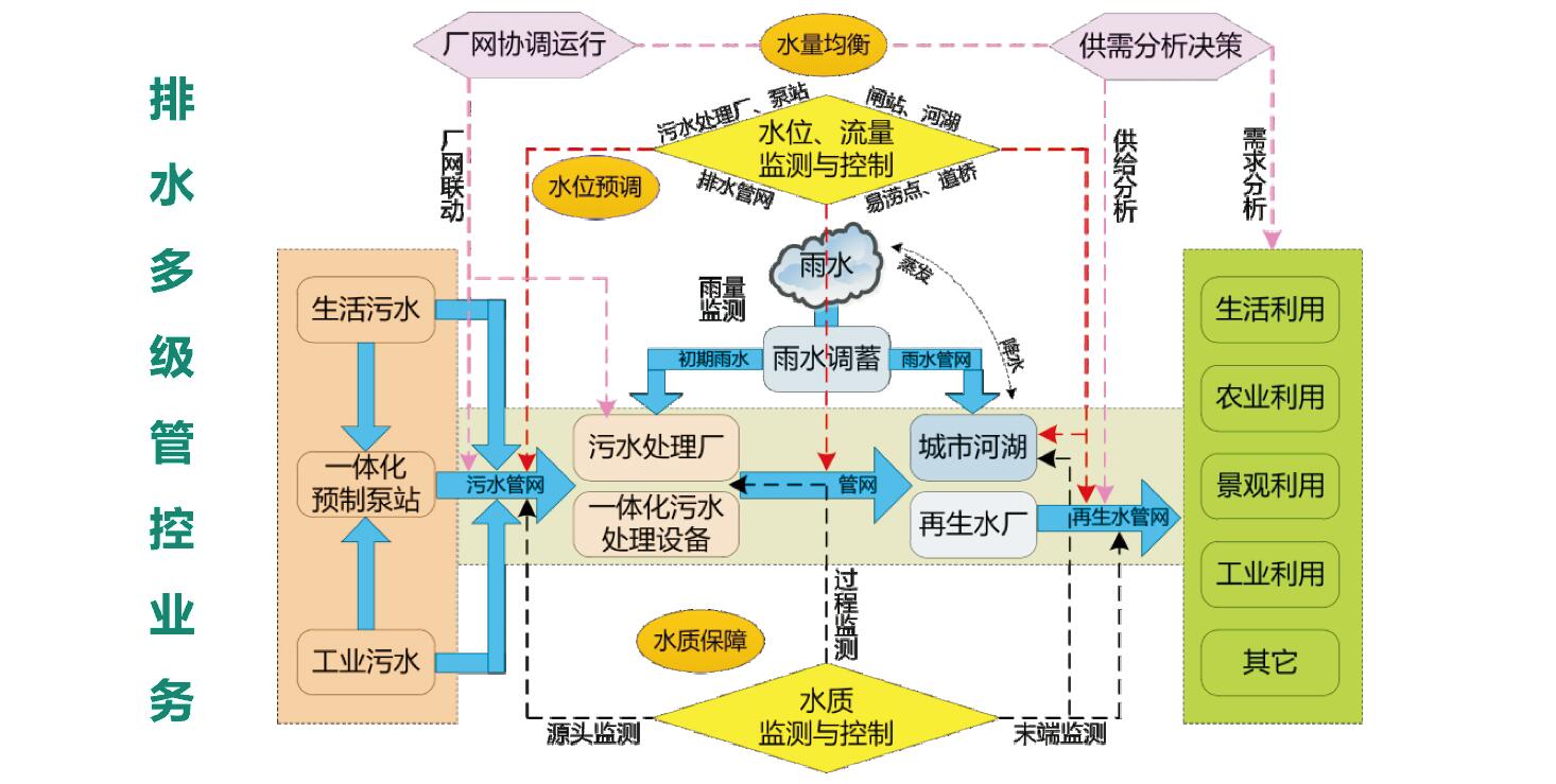 排水多級(jí)管控業(yè)務(wù)是將污水處理廠、排水管網(wǎng)、城市河湖按照“統(tǒng)籌建設(shè)、協(xié)調(diào)運(yùn)行”理念,對(duì)水務(wù)基礎(chǔ)設(shè)施進(jìn)行全要素管理,進(jìn)一步提高全域水環(huán)境綜合管理水平。
