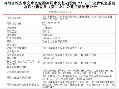 綠潔國際再傳喜訊,四川綠潔成功中標(biāo)四川省雅安水文水資源勘測局水文基礎(chǔ)設(shè)施“4.20”災(zāi)后恢復(fù)重建-水質(zhì)分析設(shè)備(第二次)項(xiàng)目,項(xiàng)目編號:CZ-ZB(2014) 73-07-2,標(biāo)的1000多萬元,中標(biāo)信息已于四川政府采購網(wǎng)站上公示。