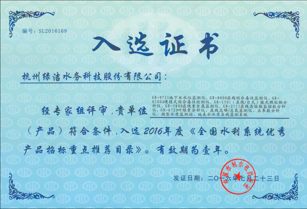 7月,綠潔科技產(chǎn)品再度成功入選《全國水利系統(tǒng)優(yōu)秀產(chǎn)品招標(biāo)重點(diǎn)推薦目錄》?!度珖到y(tǒng)優(yōu)秀產(chǎn)品招標(biāo)重點(diǎn)推薦目錄》每年組織一次優(yōu)秀產(chǎn)品的征集和評選,為各級水利管理機(jī)構(gòu)提供選購真實(shí)、可靠的水利產(chǎn)品。
