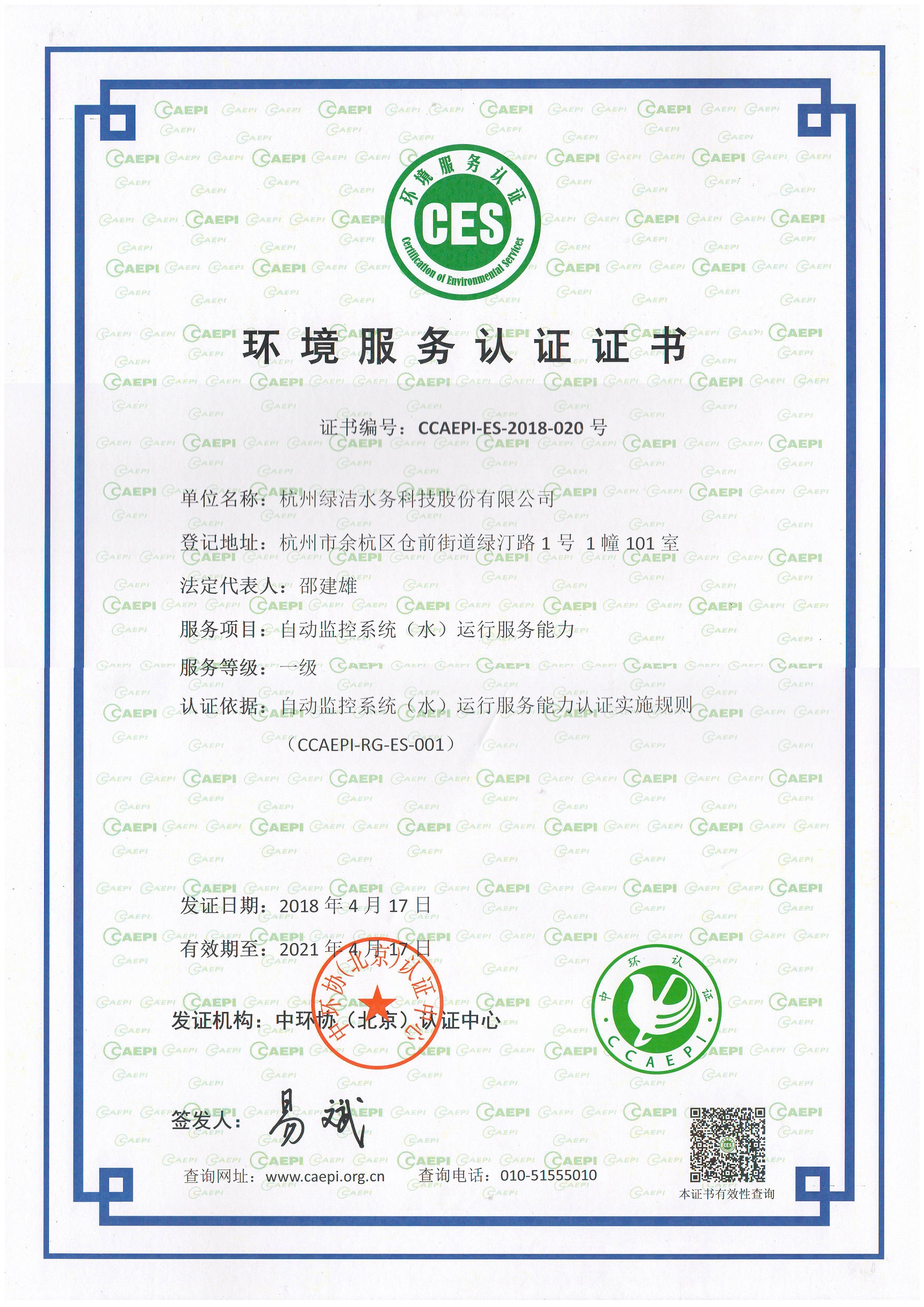 日前,綠潔科技已通過中國環(huán)境服務(wù)認證,獲得“自動監(jiān)控系統(tǒng)(水)運行服務(wù)能力”一級證書。
