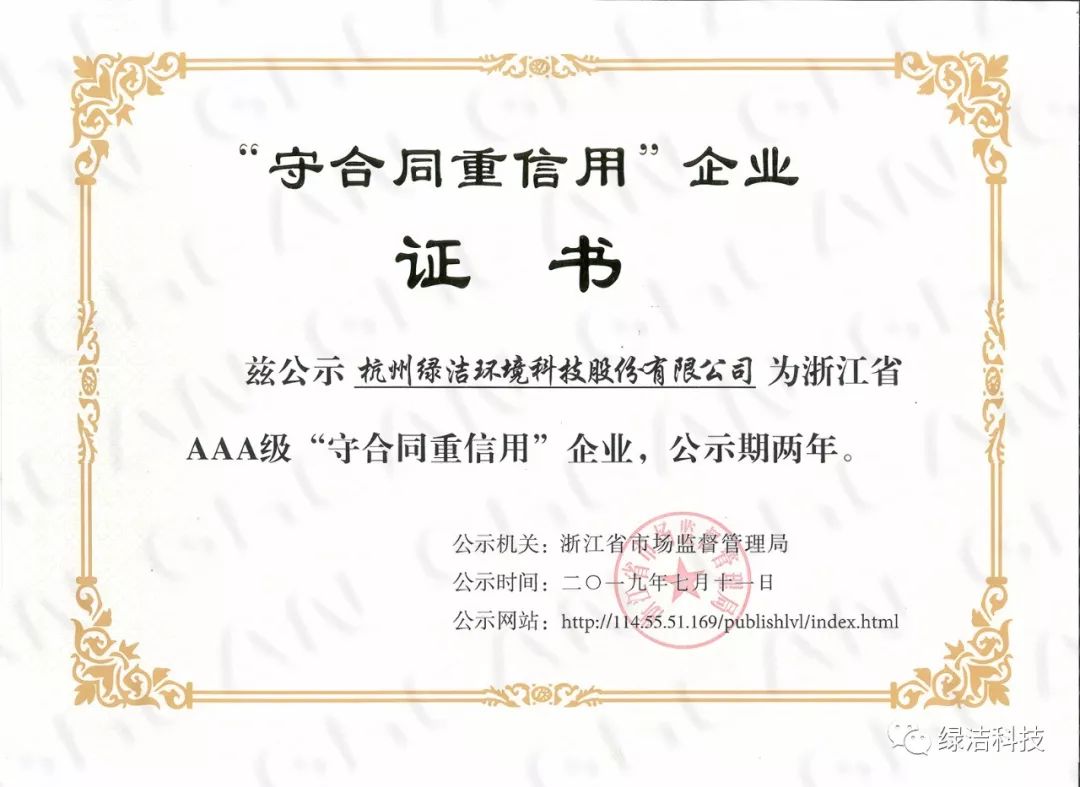 日前,杭州綠潔環(huán)境科技股份有限公司(以下簡稱“綠潔科技”)憑借完善的誠信體系建設(shè)、規(guī)范的合同管理流程、科學(xué)的管理水平,通過嚴(yán)格的層層審查評估,榮獲2019年浙江省AAA級“守合同重信用”企業(yè)稱號。