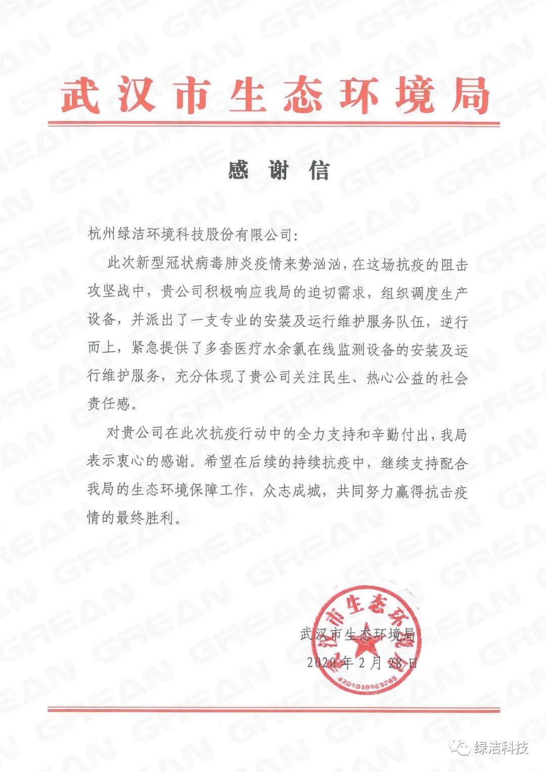 在湖北武漢疫情關(guān)鍵時(shí)刻,綠潔科技積極響應(yīng)“一方有難八方支援”的號(hào)召,捐贈(zèng)多套余氯在線監(jiān)測(cè)設(shè)備,安排企業(yè)運(yùn)維人員安裝監(jiān)測(cè)設(shè)備,并嚴(yán)格按照相關(guān)標(biāo)準(zhǔn)規(guī)范,組織運(yùn)維工程師高質(zhì)量完成在線監(jiān)測(cè)設(shè)備運(yùn)維服務(wù)工作,切實(shí)保障了武漢人民群眾飲水安全。特此,武漢生態(tài)局向我司發(fā)來(lái)感謝信,就疫情期間,綠潔科技提供的幫助以及工作人員堅(jiān)守敬業(yè)和向險(xiǎn)而行的勇氣表示充分的感謝與敬意。