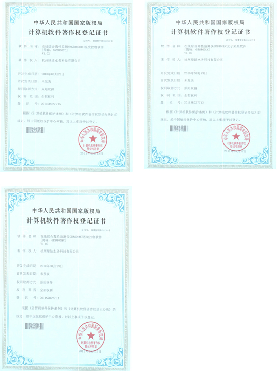 杭州綠潔水務(wù)科技有限公司申報(bào)的《在線綜合毒性監(jiān)測(cè)儀GR8800LC光子采集軟件》、《在線綜合毒性監(jiān)測(cè)儀GR8800MC運(yùn)動(dòng)控制軟件》、《在線綜合毒性監(jiān)測(cè)GR8800TC溫度控制軟件》3項(xiàng)軟件一次性通過國(guó)家版權(quán)局的認(rèn)證,獲得3項(xiàng)計(jì)算機(jī)軟件著作權(quán)登記證書。這是杭州綠潔水務(wù)公司在軟件著作權(quán)保護(hù)方面的新突破,標(biāo)志著杭州綠潔水務(wù)公司在知識(shí)產(chǎn)權(quán)保護(hù)方面跨上了一個(gè)新的臺(tái)階。